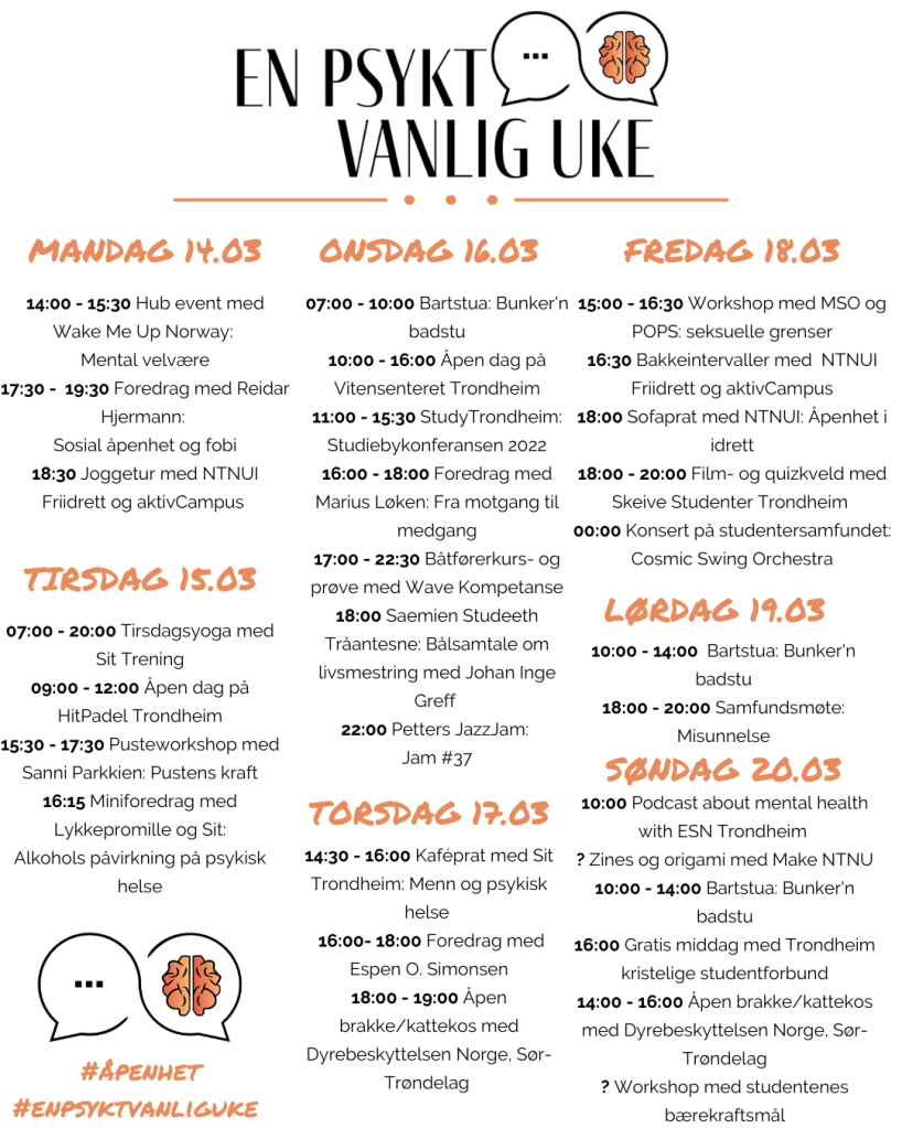 Studentfestivalen En Psykt Vanlig Uke foregår fra 14-20 mars. Den dreier seg om studenters mentale helse, og skal fungere som motivasjon for at psykisk helse får økt fokus. Festivalen består av ulike foredrag, arrangement og events som fremhever økt fokus på mental helse som videre kan inspirere, hjelpe og støtte alle studenter i Trondheim.